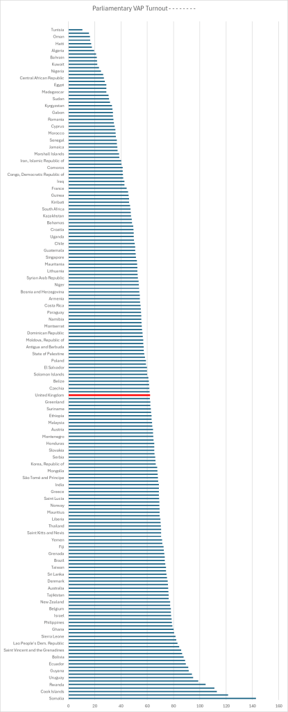 When it comes to voter turnout, the UK is neither the best or worst. If we calculate turnout as the proportion of eligible people who voted (as we should) then the UK came towards the middle of the pack in 2019. Where will 2024 be?