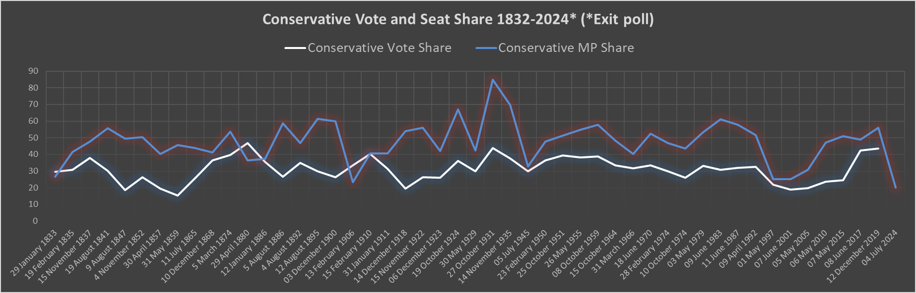 The projected Conservative seats numbers is the lowest since before 1832: